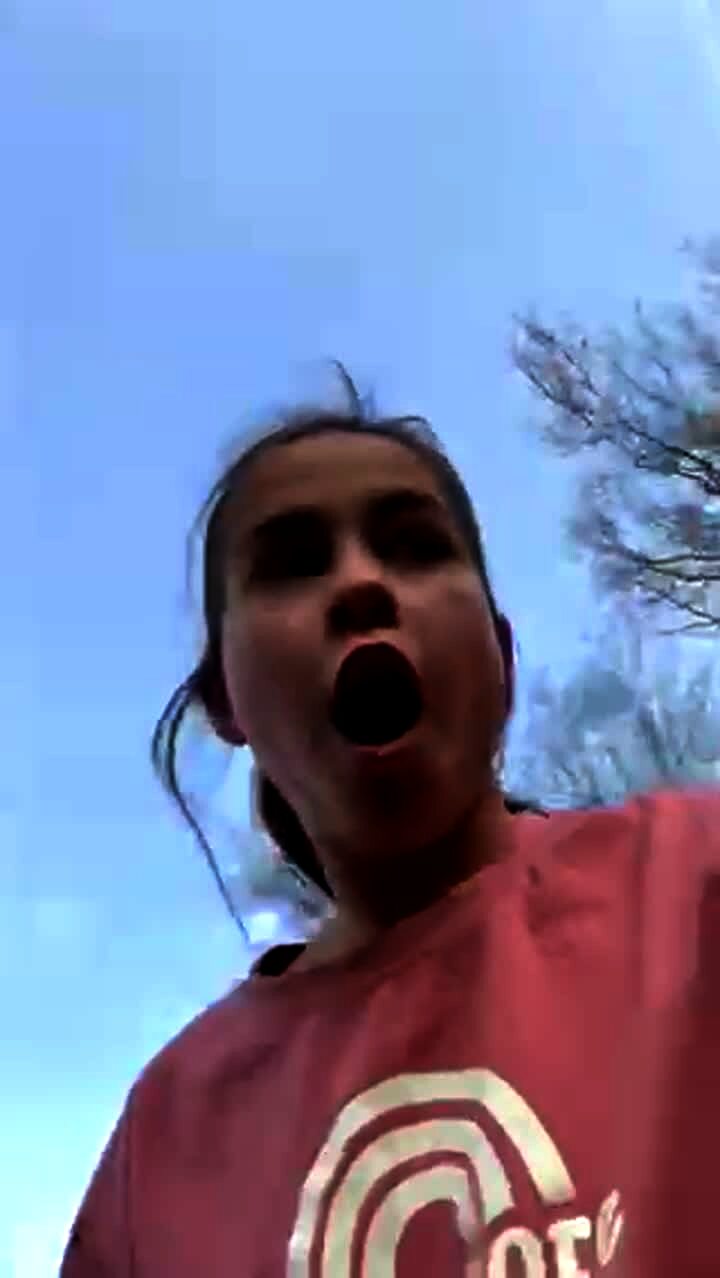 A young girl puts her phone down in the yard to record herself on the swings, and a border collie dog pees on it. First person POV.