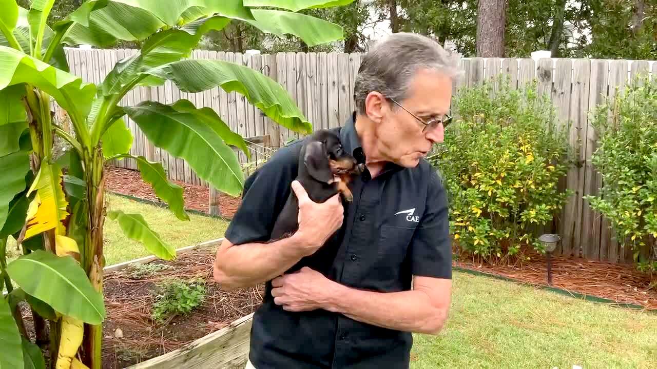 A senior man holds a dachshund puppy in a backyard and says that she will go to the bathroom in a fenced enclosure that he made. He puts the dog into the enclosure and she immediately squeezes through the posts in the fence.