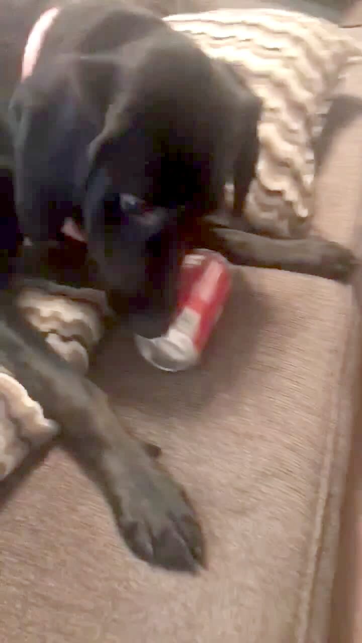 A woman asks her labrador dog what it has while it chews on a soda can on the couch until it breaks open.