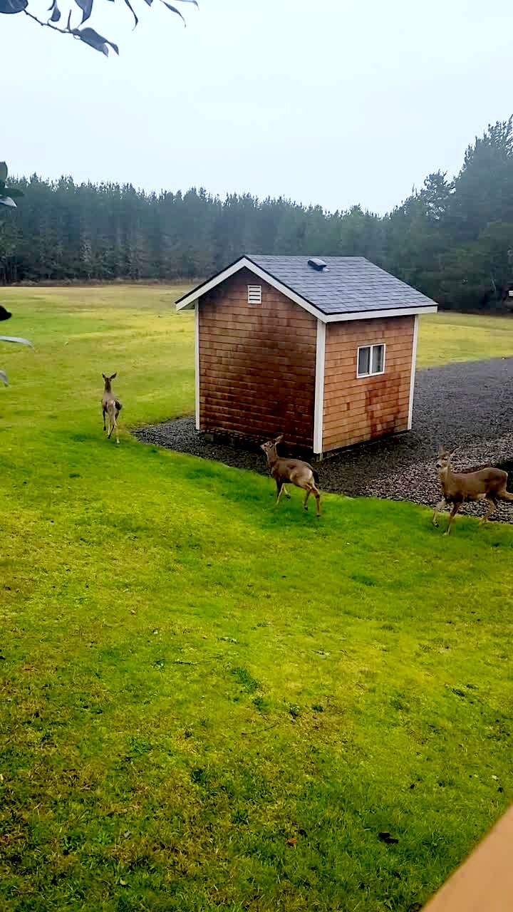 A woman greets a herd of deer in a yard, then her dog chases them away.