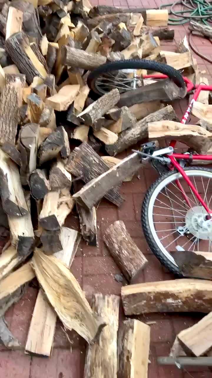 A young man says "this piece right here," then pulls one log out of a stack of firewood and knocks it over as the entire wood pile collapses.