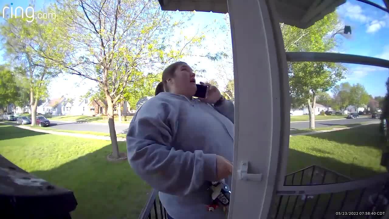 A woman adjusts a rug on the front porch, then she stops and frowns when a male voice says "what are you doing lady?" through the doorbell camera. Security footage.