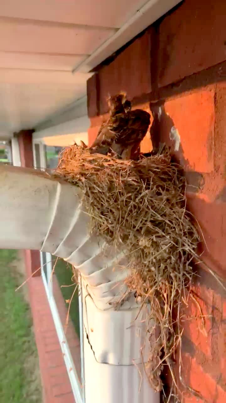 "Mama Bird Wants A Word" A woman puts a baby bird back into a bird nest on the outside of a house, then runs away and screams while birds chase her.
