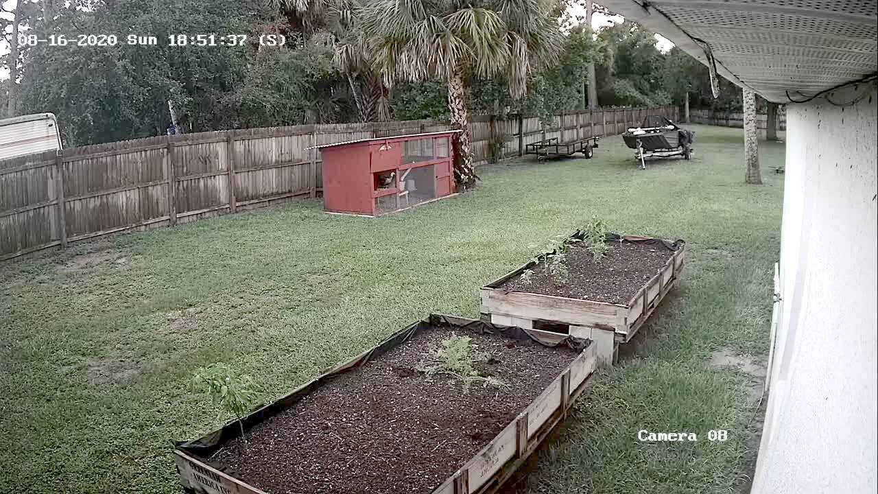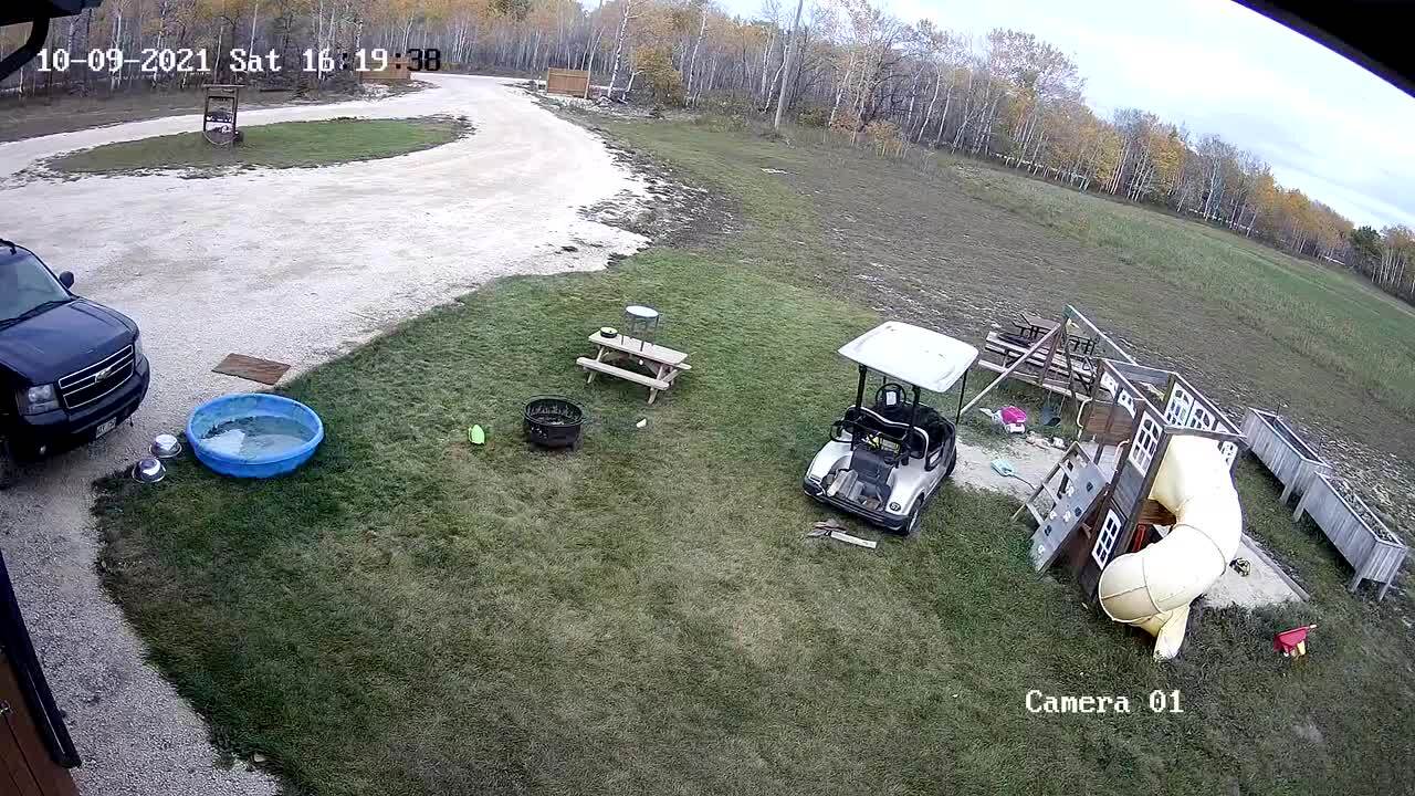 A young boy tries to take out the trash in the driveway, but the bag breaks and spills. Security footage.