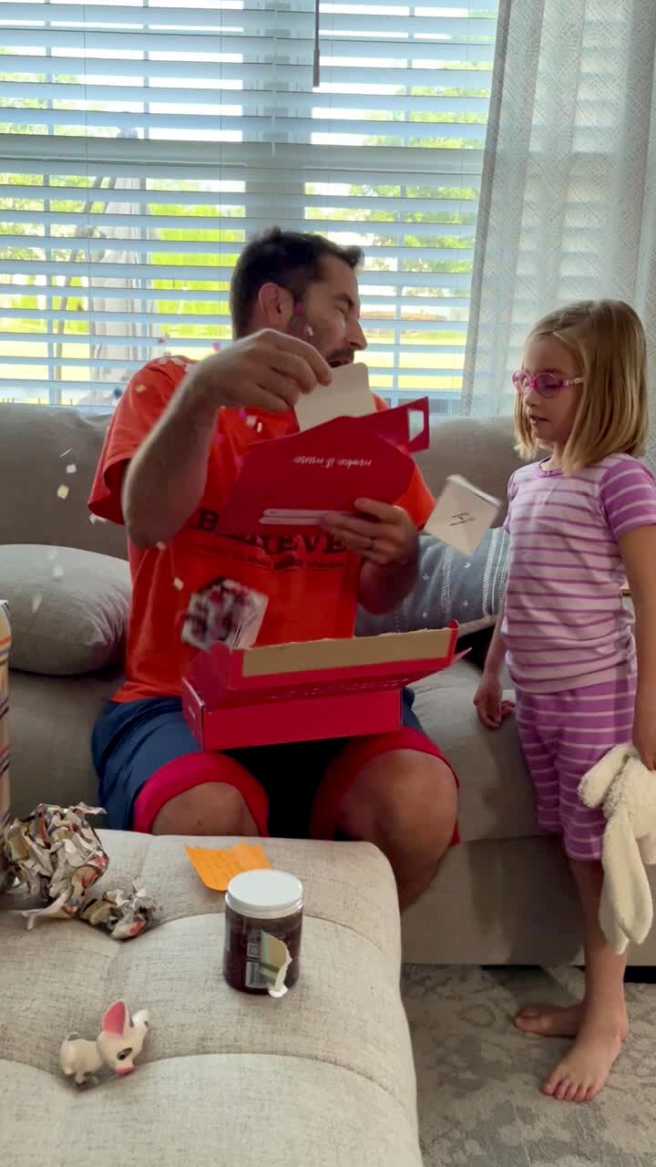 As a dad puts dishes in the dishwasher, his twin toddler daughters take them out, one by one. He thanks them for helping.