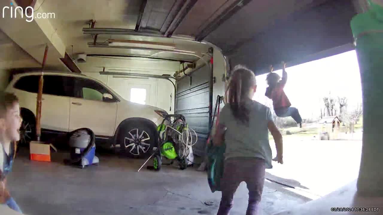 A young girl grabs the bottom of a garage door and lets herself be lifted up into the air while it opens. Her older sister catches her and pulls her safely back to the ground. Security footage.