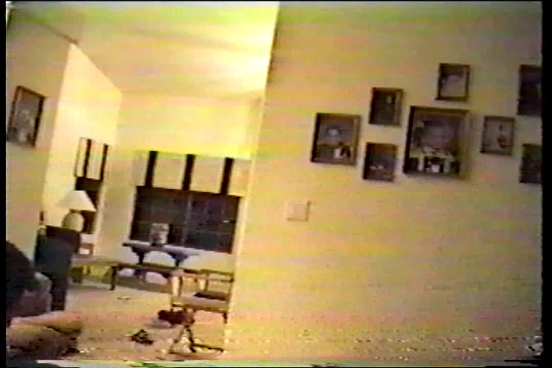 A man falls through a house's ceiling while he works in an attic and causes insulation to fall on the living room floor. Security footage.