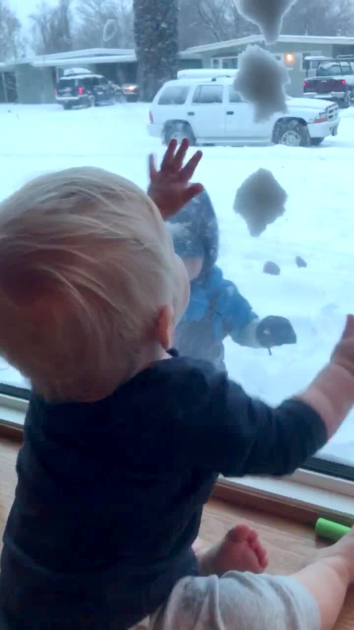 A baby boy laughs as a man and a tot boy throw snow at the window the baby boy is sitting at.
