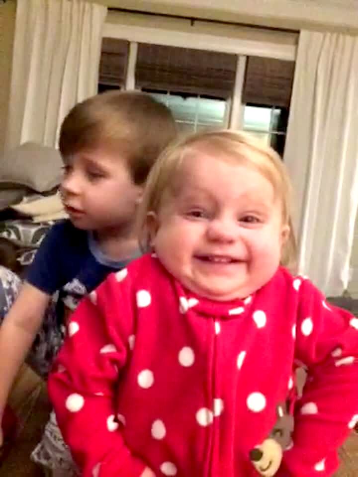A woman records a video greeting of a young boy while he congratulates his aunt and uncle for their pregnancy and a tot girl sits in front of the camera and makes a funny face.