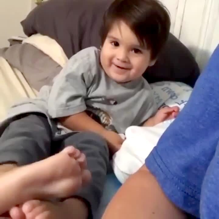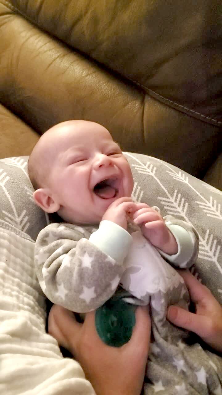 A woman plays with a baby boy and makes him giggle then asks him, "do you think mommy's funny?" He says, "no."