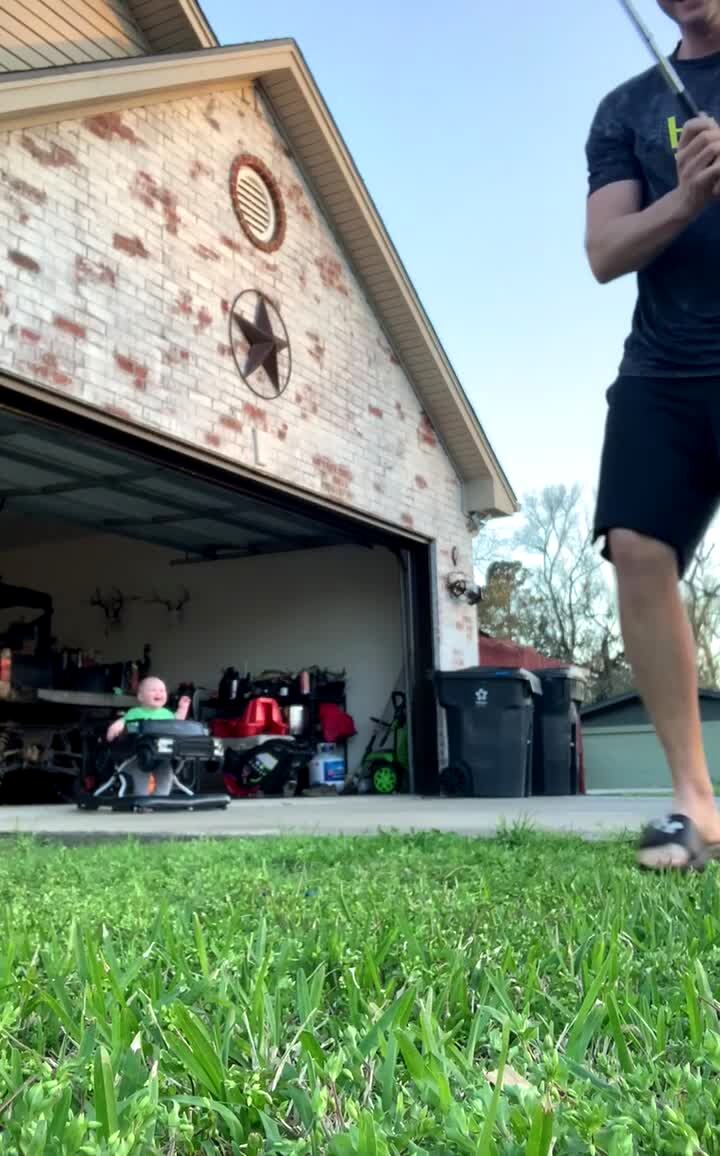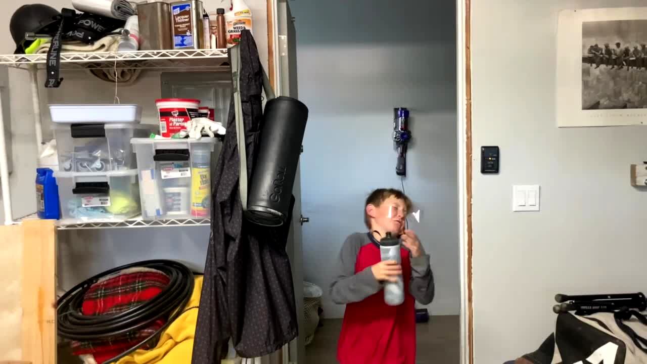 An off-camera father calls his young son out to the garage and tells him to hustle and the boy runs into a piece of tape stretched across the door and it wraps around his head.