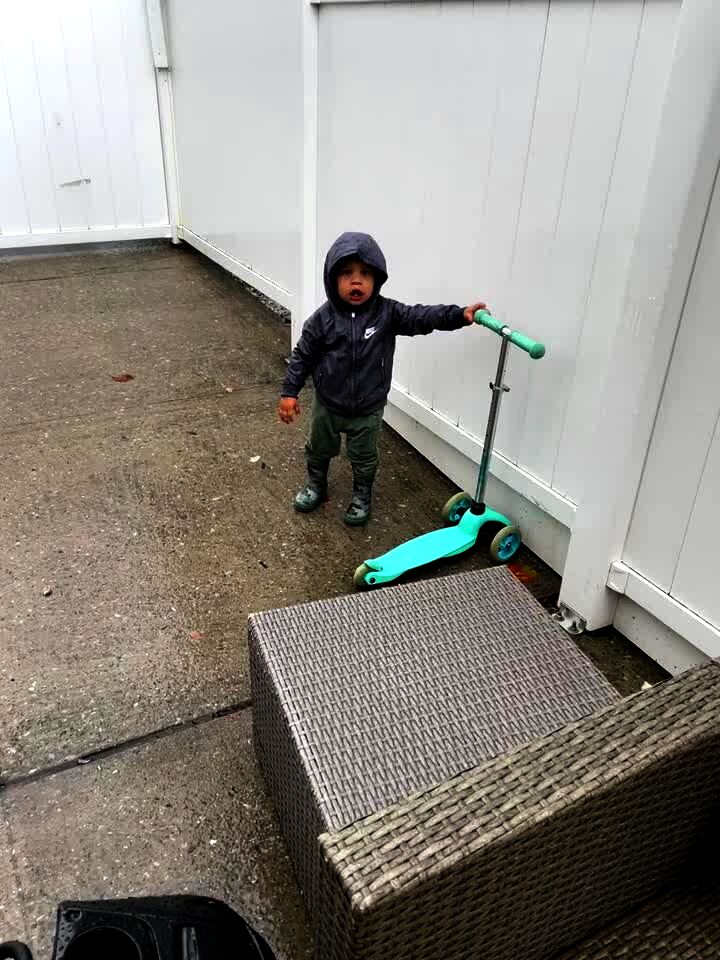 A young boy rides a scooter out of the garage in the rain when he runs into a fence, making a surprised face.