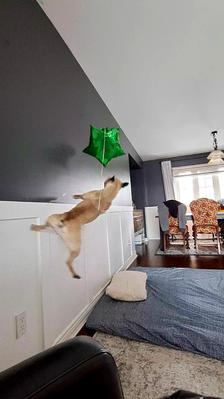 A dog leaps up and flips in the air as he tries to get to a helium-filled balloon that floats overhead.