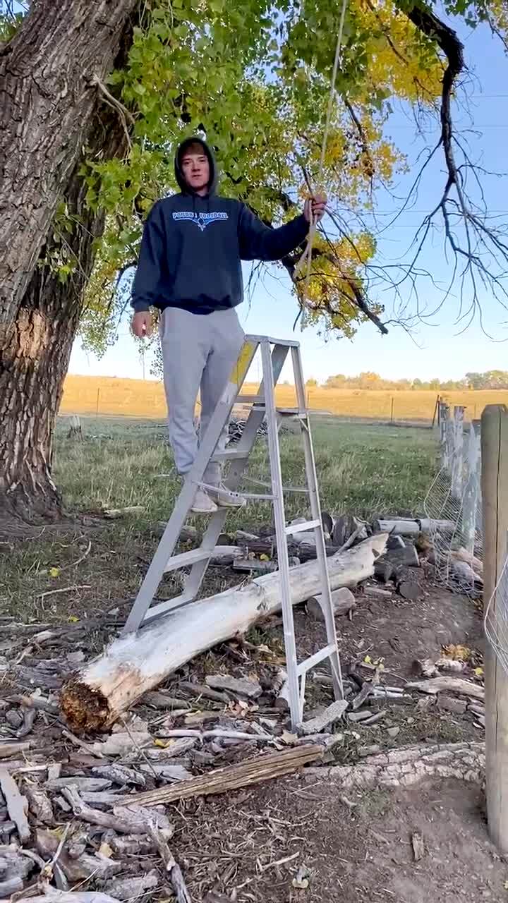 A young man lists off some safety tips before he zip lines in a yard, then the rope breaks, and he falls down.