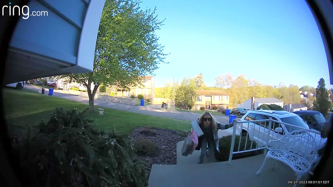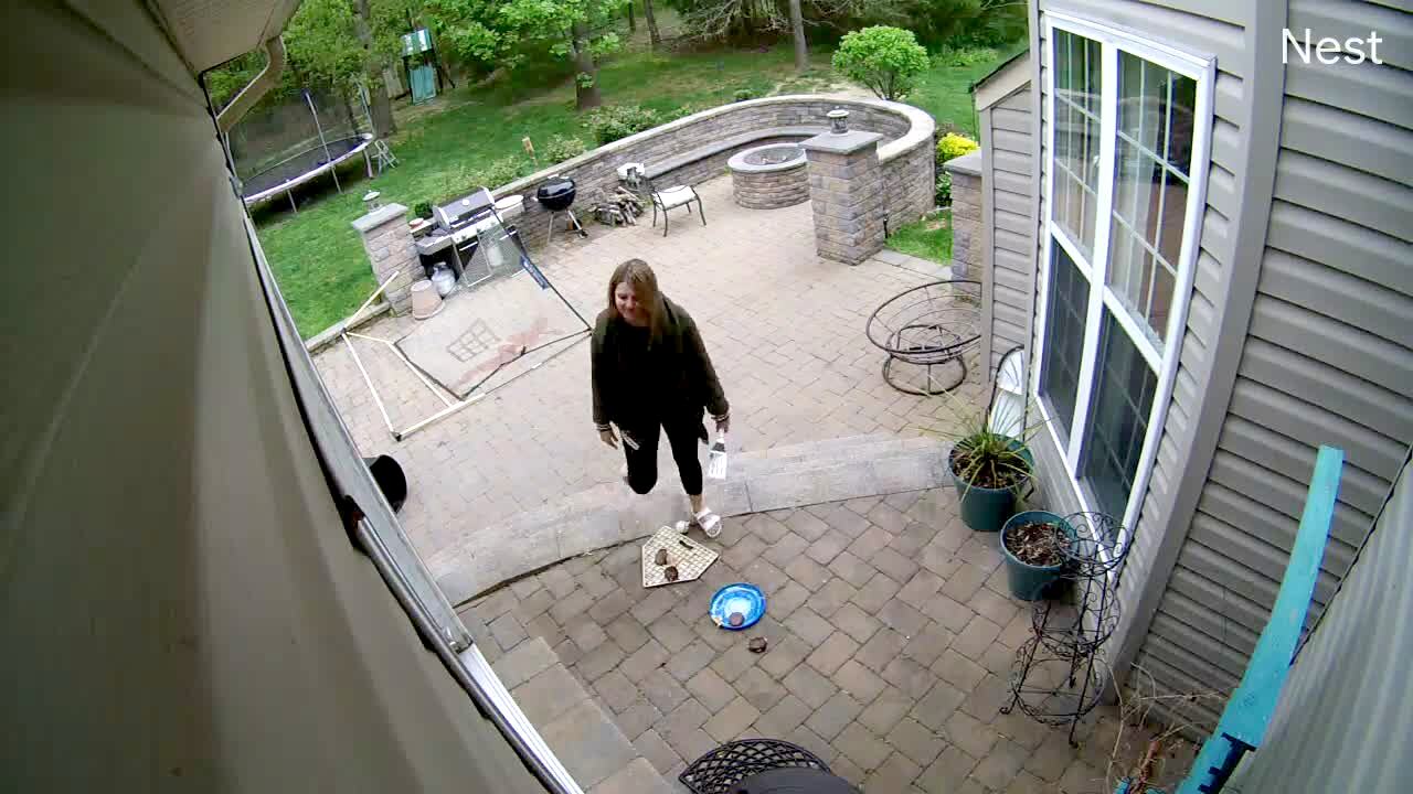 A woman trips and falls over a dog toy on her way out of the house. Security footage.