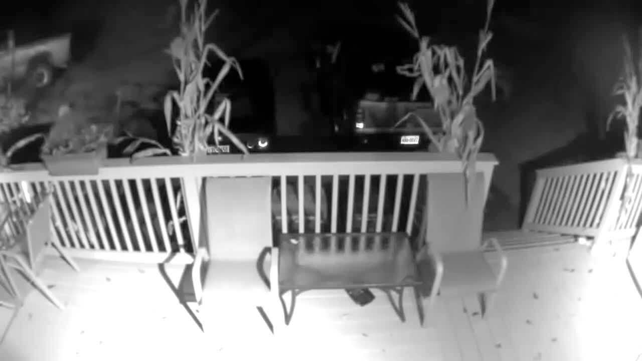 A raccoon sits in a flower pot on a deck railing, then falls into the yard with it. Night. Security footage.,