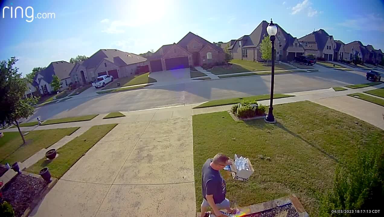 A man trips and falls while he carries a box of trash out into the yard, and he spills the trash everywhere. Security footage.