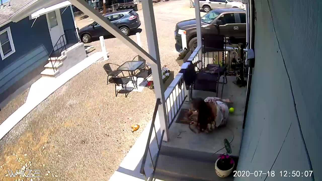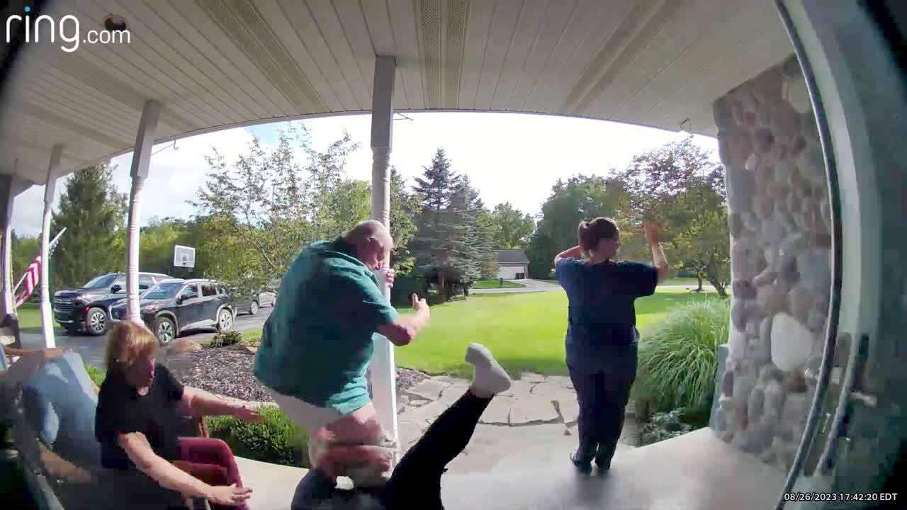A woman joins her family on a porch, but she trips and falls and pulls her father's pants down. Security footage.