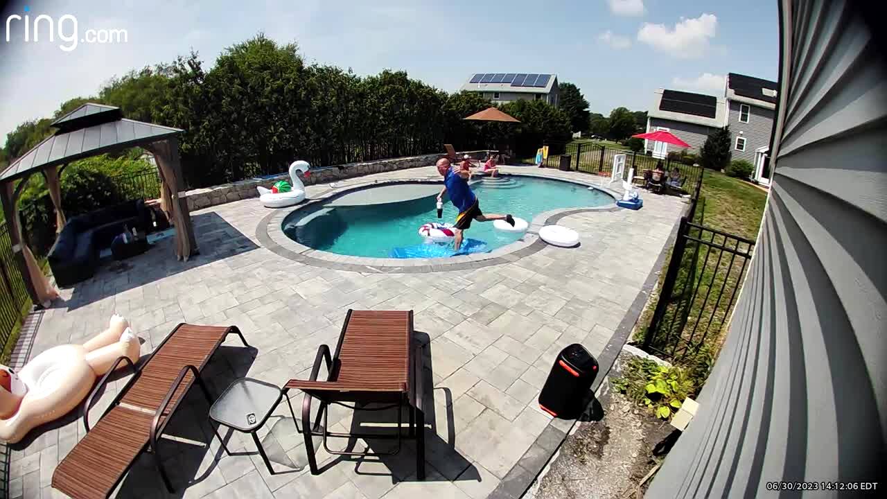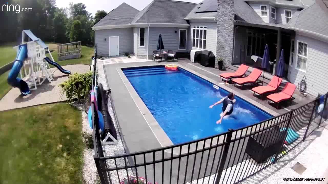 A man trips and falls into a backyard pool, and a wave of water crashes out of the pool. Security footage. Music not cleared. Featured talent cleared (the man who falls into the pool).