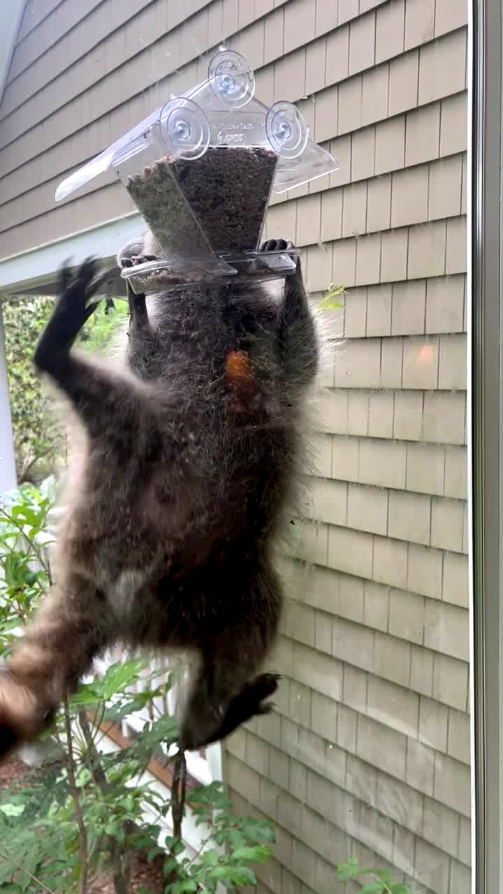 A raccoon holds onto a bird feeder fastened to a window by suction cups and eats out of it before losing his grip and falling to the ground.