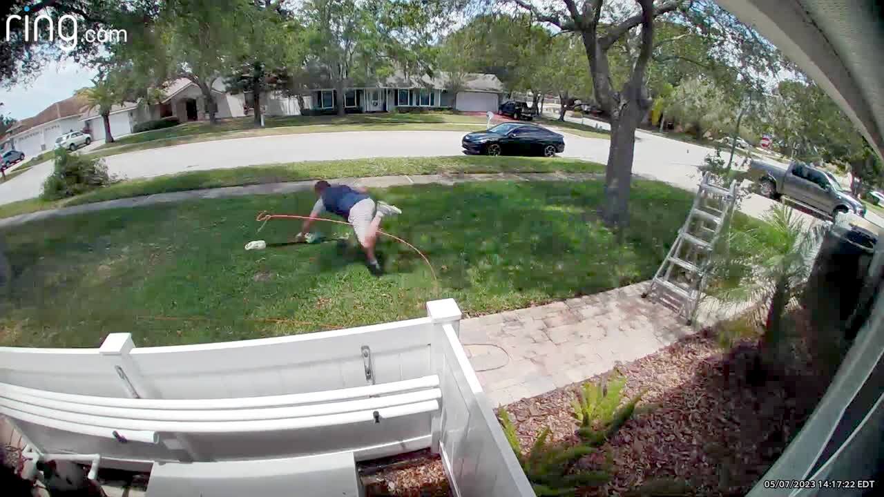A man on a ladder pulls on a cut tree branch to remove it in his front yard, then he jumps off of his ladder, stumbles, and falls down. Security footage.