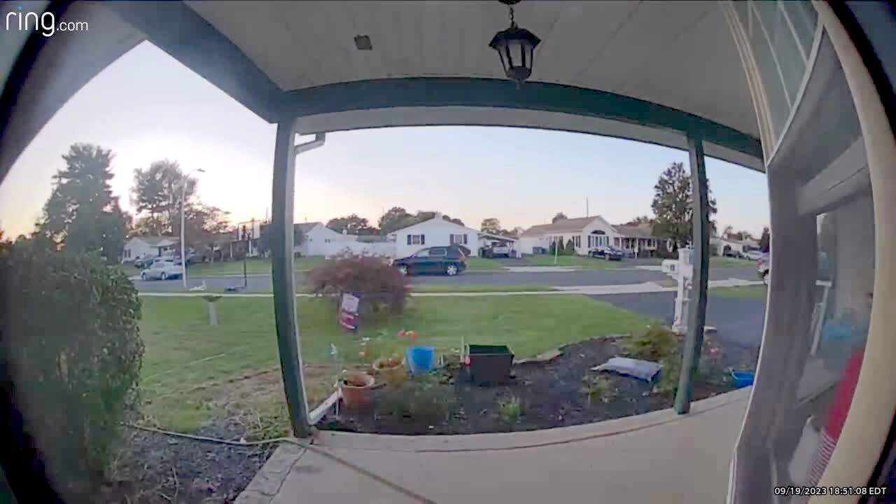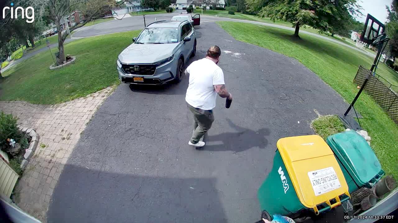 A man trips and falls when he leaves a house. Security footage. Featured talent cleared only (the man who falls).