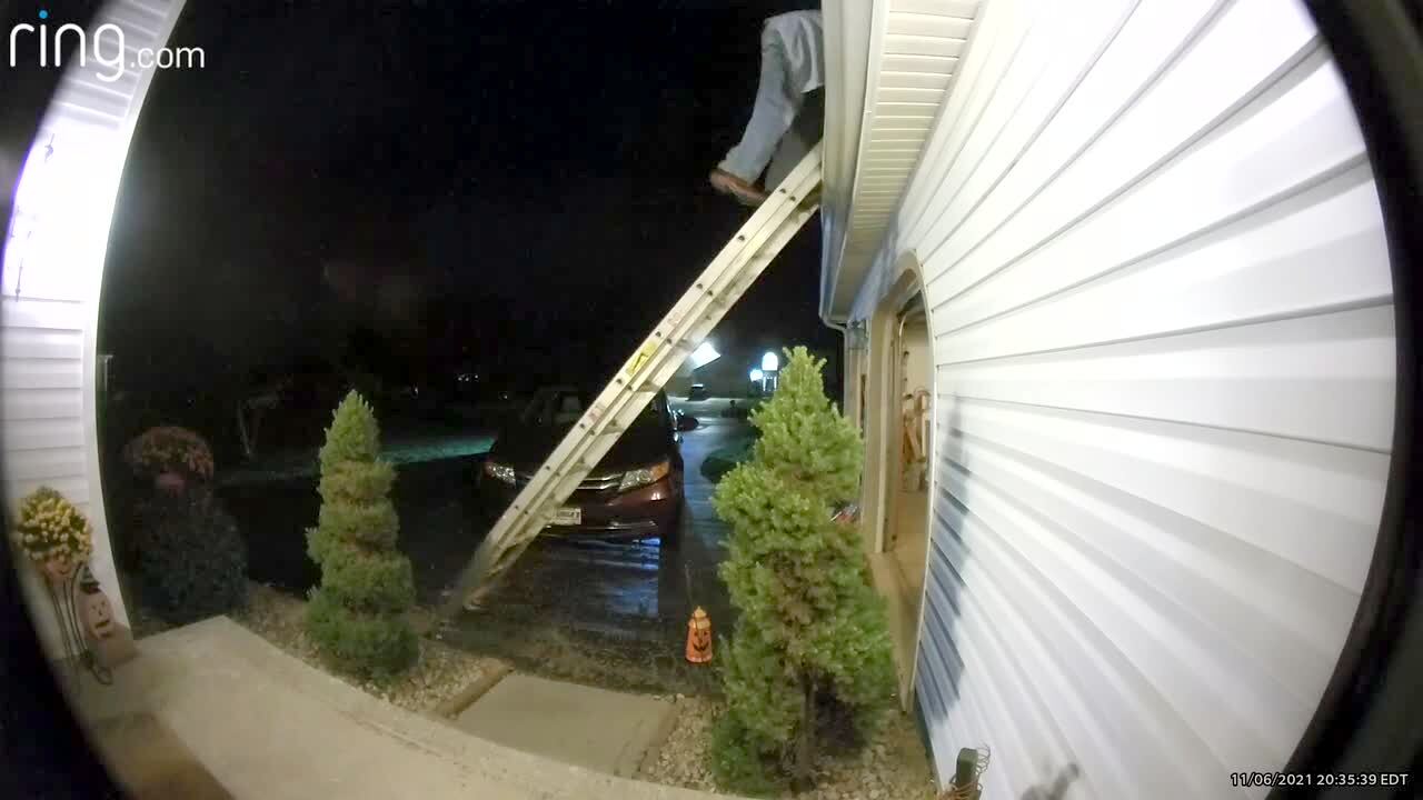 A man tries to use a ladder to get off the roof of a house, but he falls down with the ladder, and part of the roof breaks off. Security footage.