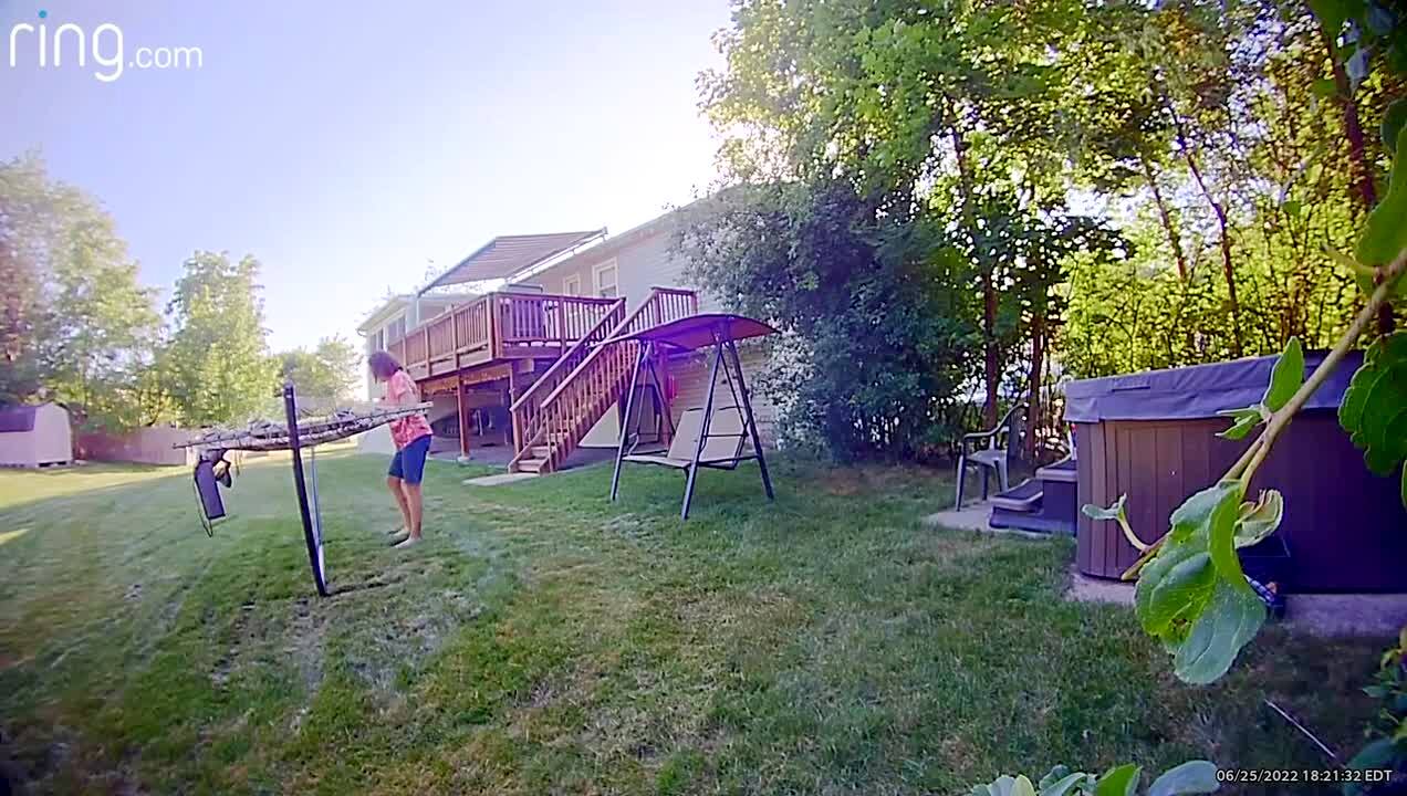 A woman leans into a hammock in a yard, then it falls over. Security footage.