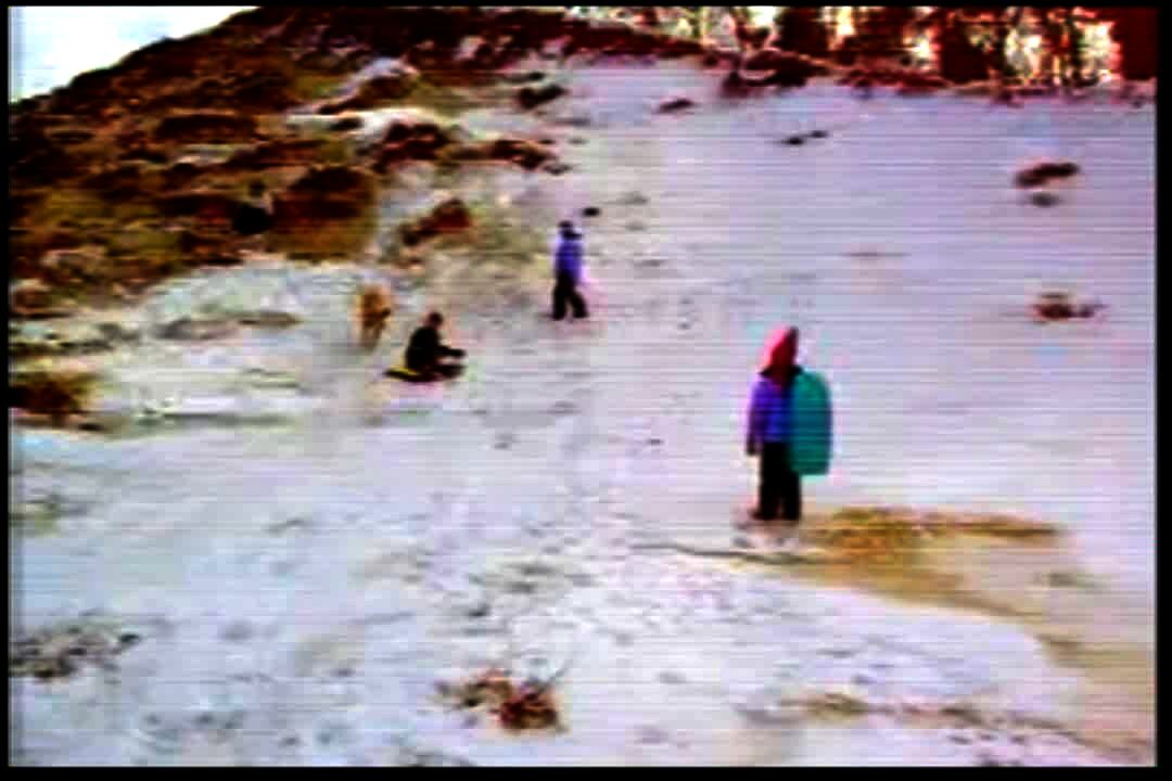 3 boys sled down snow hill. 1st boy to go down gets knocked over on the pavement when 2nd boy sleds into him. Then when boy is lying on the ground, 3rd boy sleds down and runs into his shoulders, he slides.