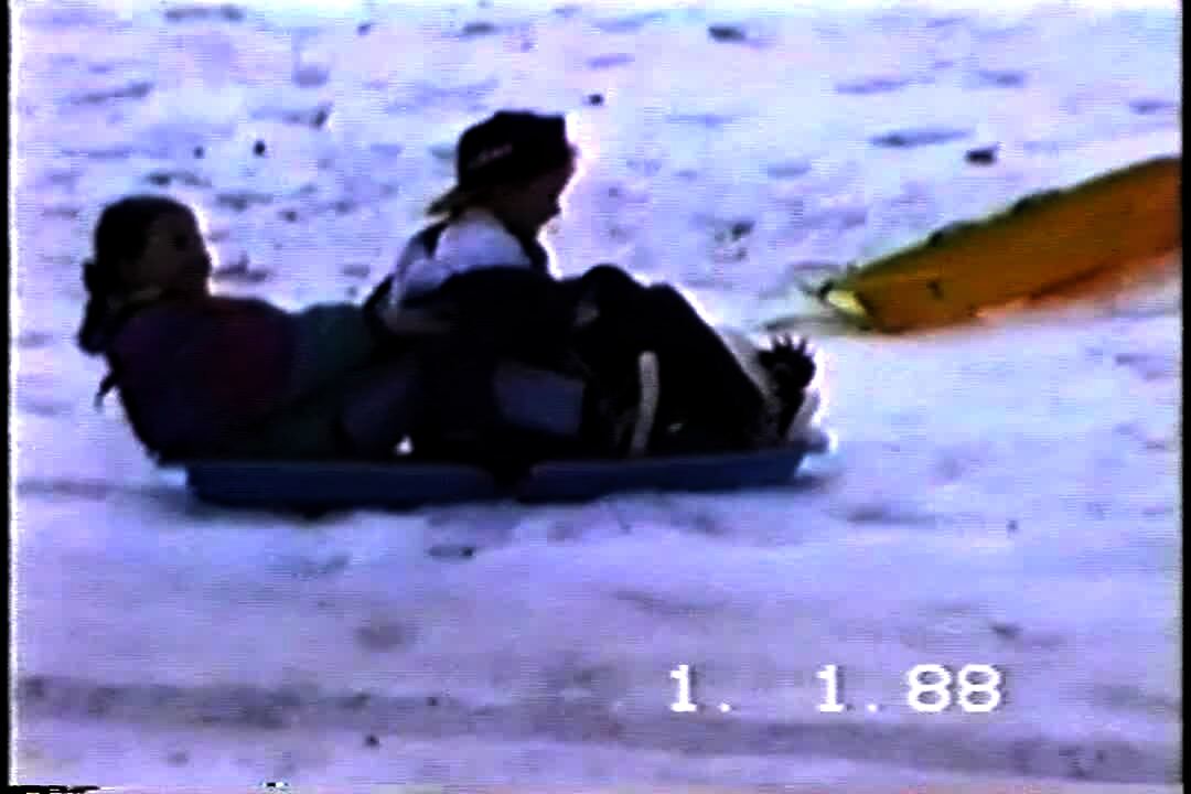 A woman, a boy, and a young girl ride a sled together in the winter snow down a hill. When they get to the bottom, the girl falls off the front and gets run over by the sled.