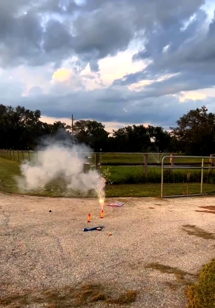A young girl reacts with excitement when fireworks go off outside then chair collapses with her inside and falls to grass.