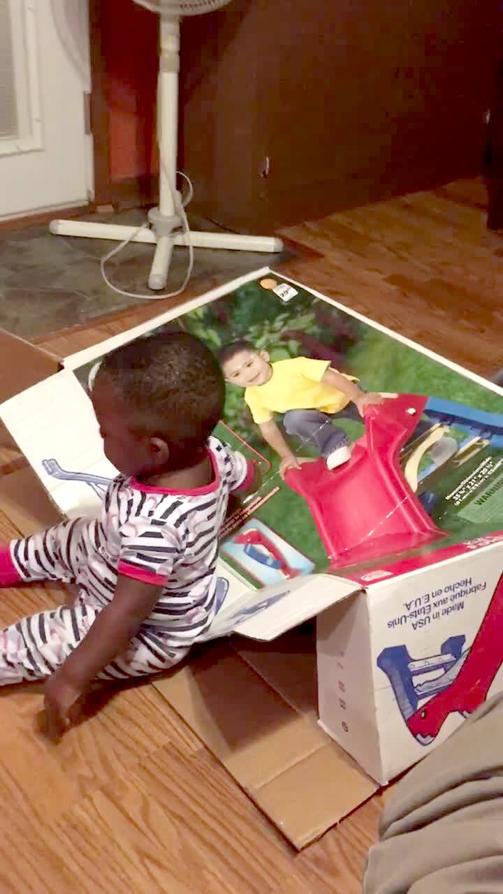 A tot boy slides down a picture of a slide on a cardboard box in a living room.