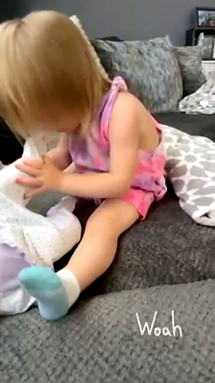 A tot girl stands when she is strapped to a doll stroller, and walks with it on her back across the living room.
