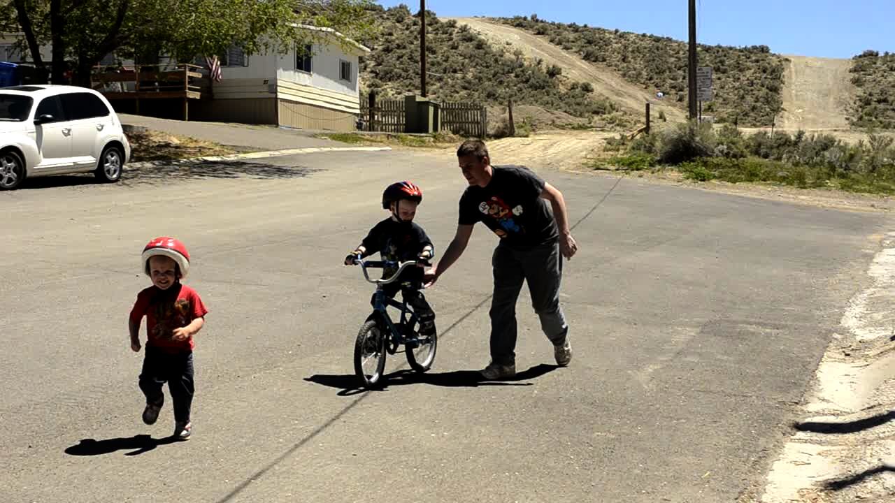 Boy learns to ride bicycle, his mom helps him. Boy falls gently and says "Ow my weenie." They should make weenie pads now." Kids say.