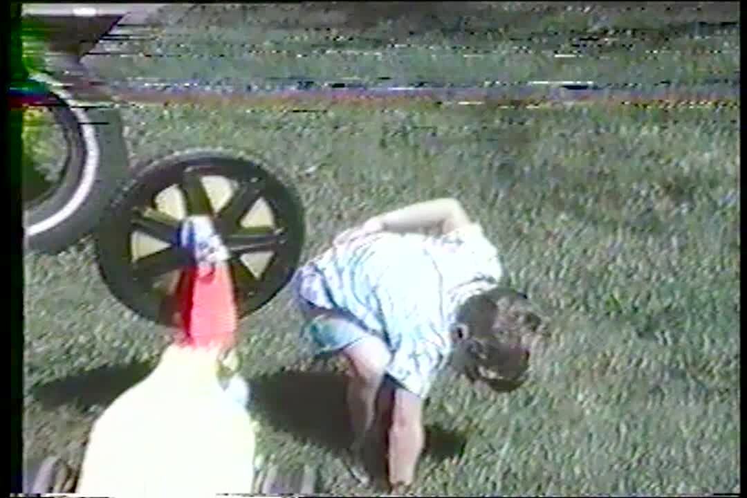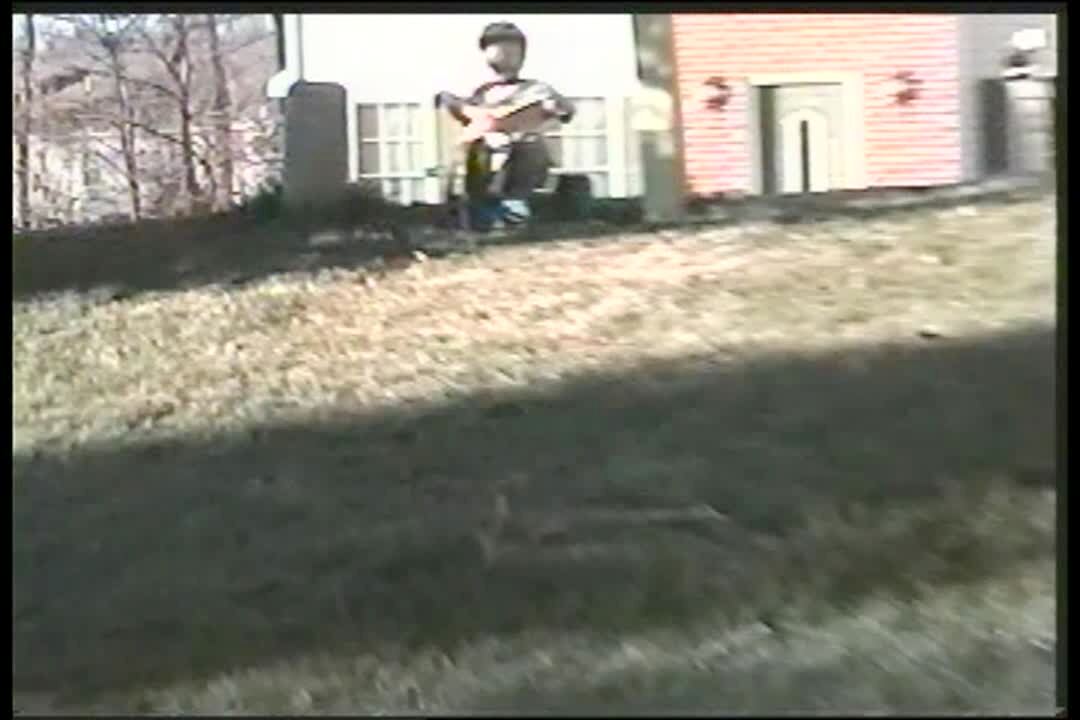 Young boy rides his Big Wheel bike over a ramp & falls twice. His big brothers cheer him on.