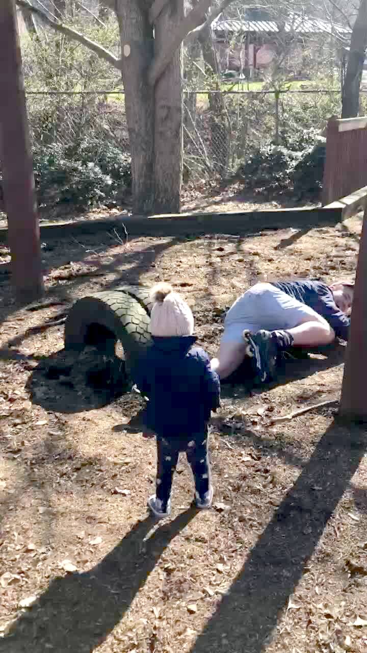 A woman says "hey" when she sees an orange cat in a room on a security camera, which causes the cat to back up and jump out of sight. Security footage.