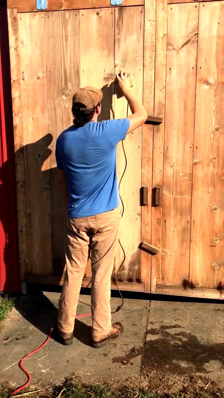 A man stands outside a barn, and sands the doors down. A woman pranks him, and slides a fake snake under the barn doors, to his feet. He screams and runs, and then laughs.