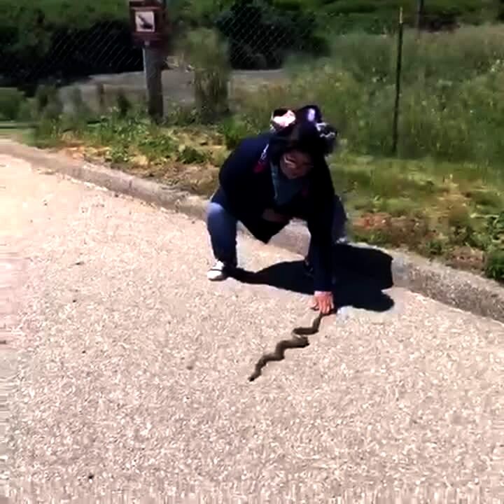 A snake moves across the ground. A woman touches the snake's tail. The snake turns around and lunges at her. She screams and runs away. The snake goes into the grass.