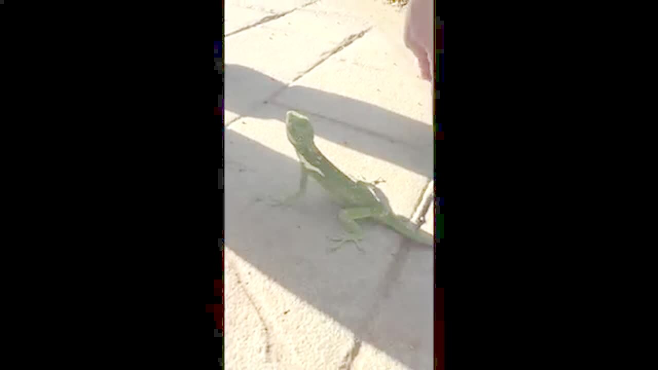 An iguana jumps off a ledge onto a woman's arm in a pool. She screams and a man pushes it off of her arm. Slow motion.