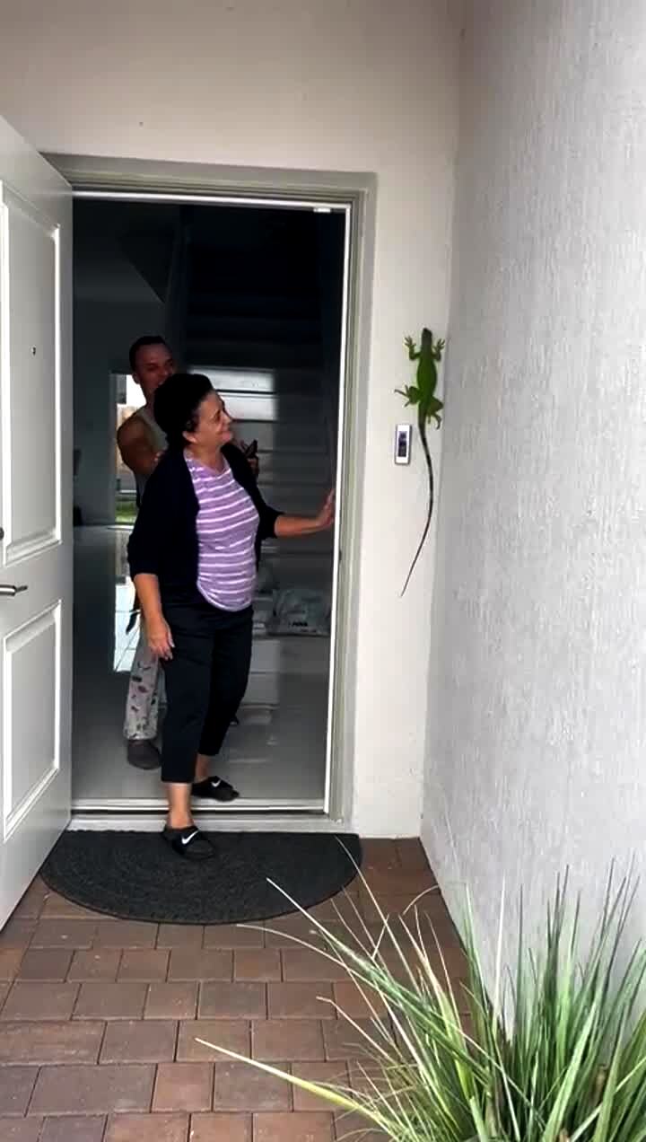 A man walks out of his house and screams when he sees an iguana on the doorway.