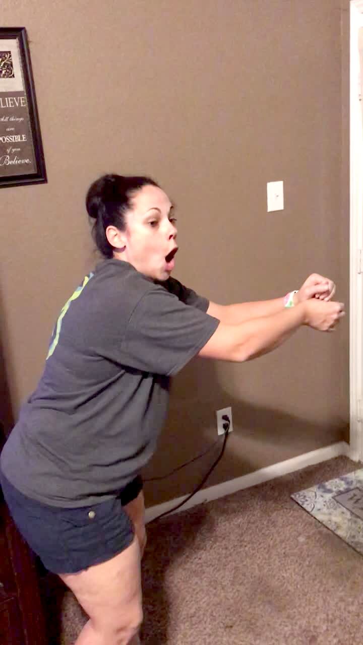 A woman in the house panics as she struggles to catch a frog. Once she does catch it, her family doesn't open the front door for her. She opens the door herself to let the frog out.