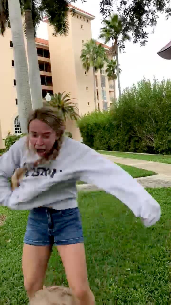 A woman holds a gecko lizard and it crawls into her sweatshirt and she screams and squirms in a park.