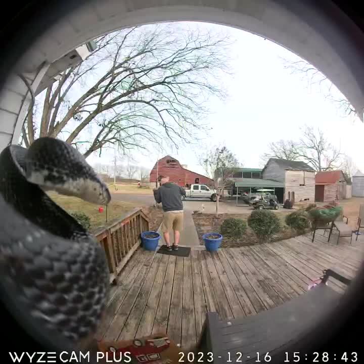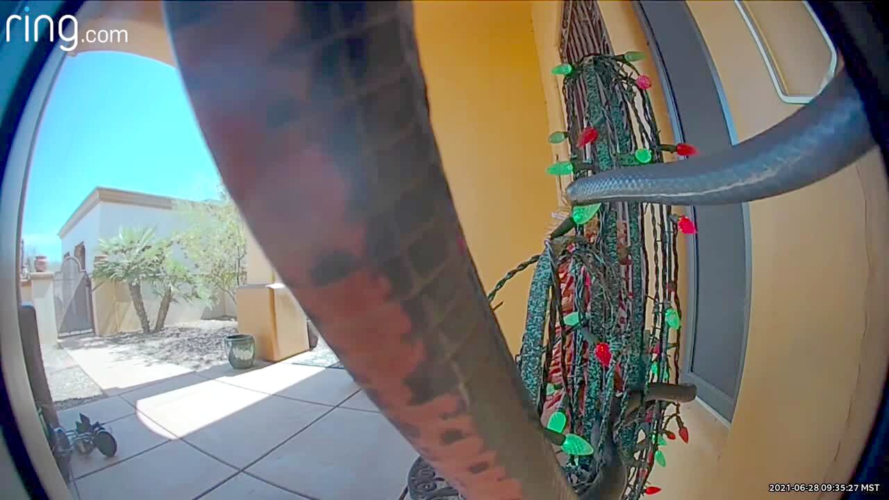 A snake crawls across the security camera and onto a set of Christmas lights on the front door. Security camera.