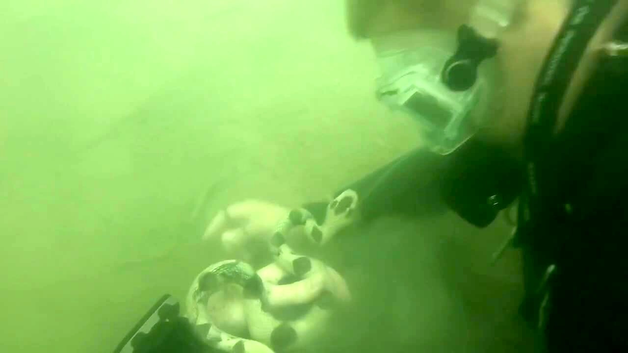 A person finds a rubber snake on a dive in the ocean and scares another diver with it.