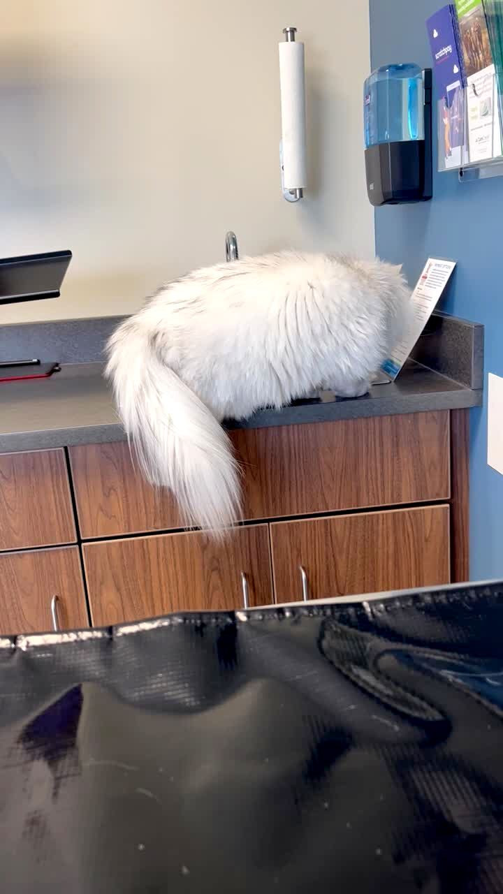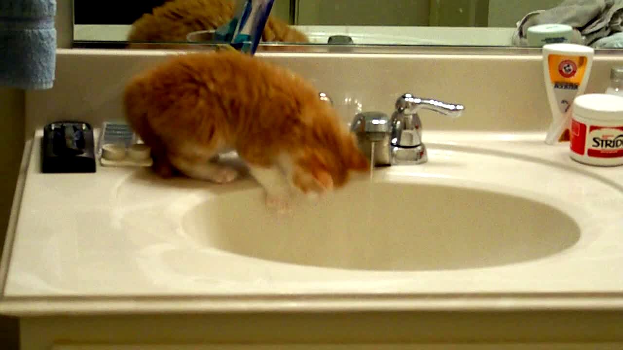 A cat at the veterinarian's office stands on the sink and accidentally activates the automatic soap dispenser. The cat jumps into the air and runs away.