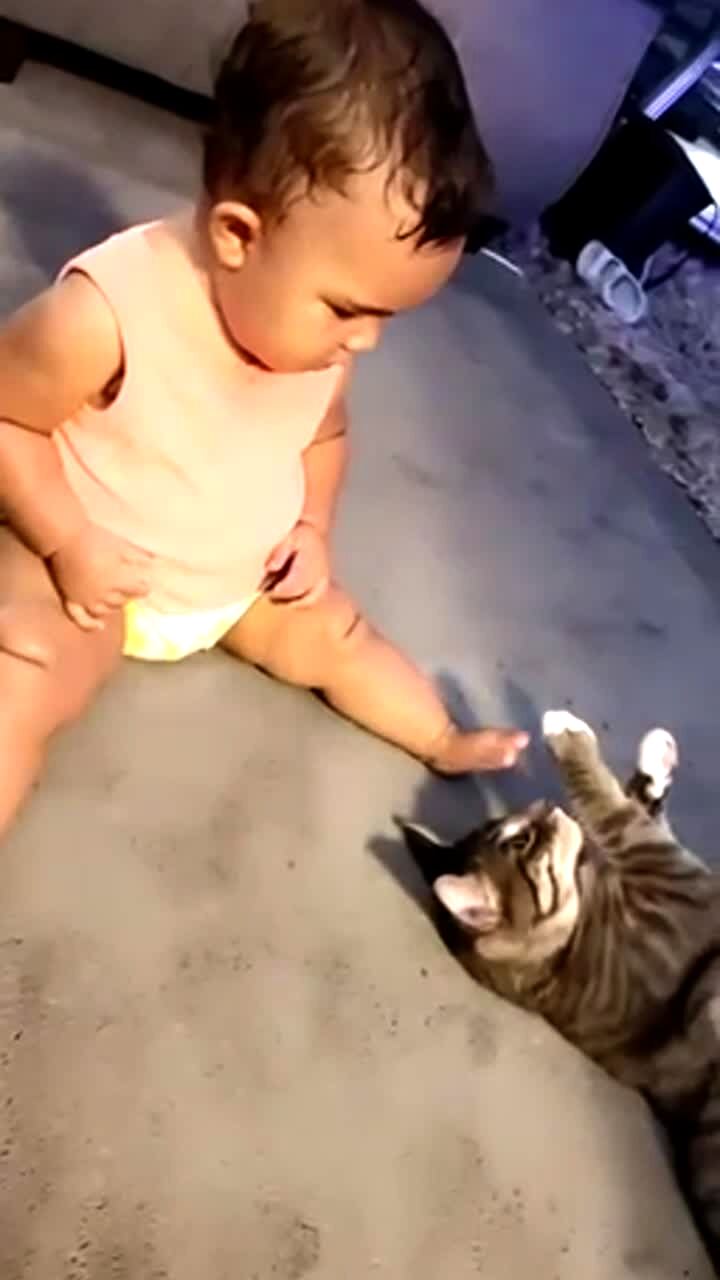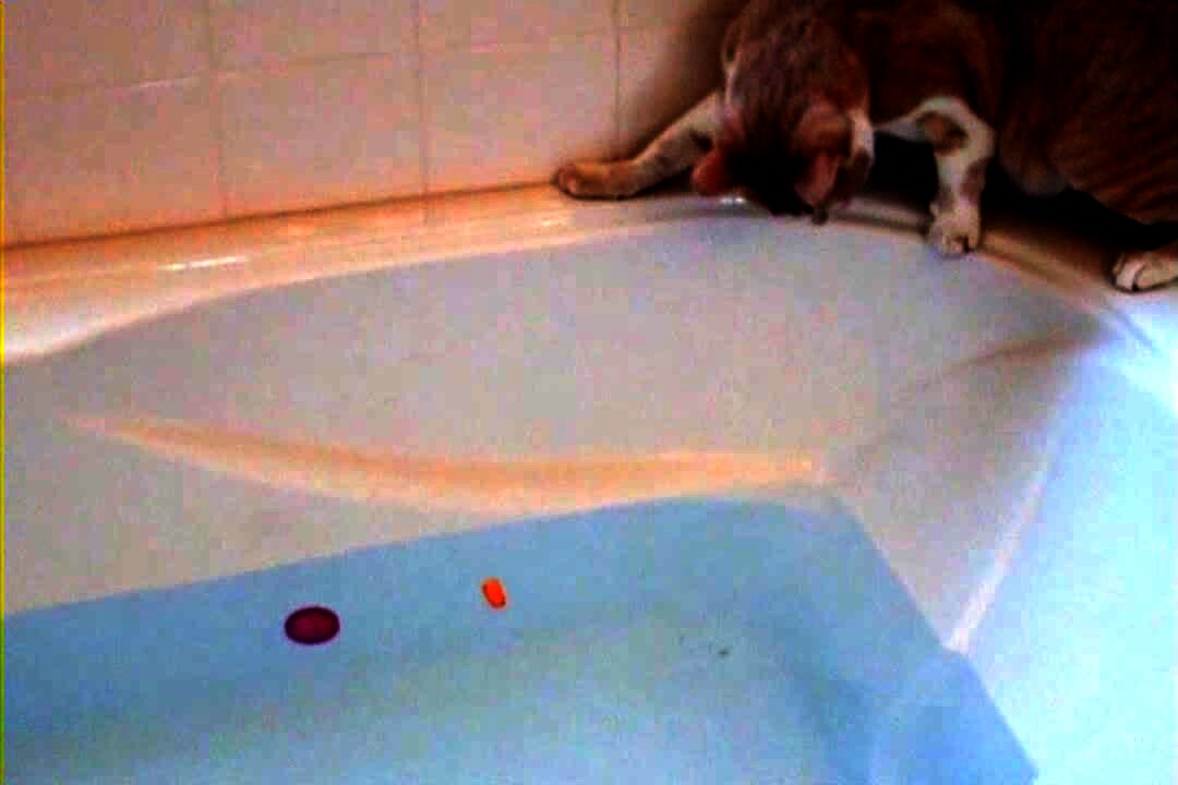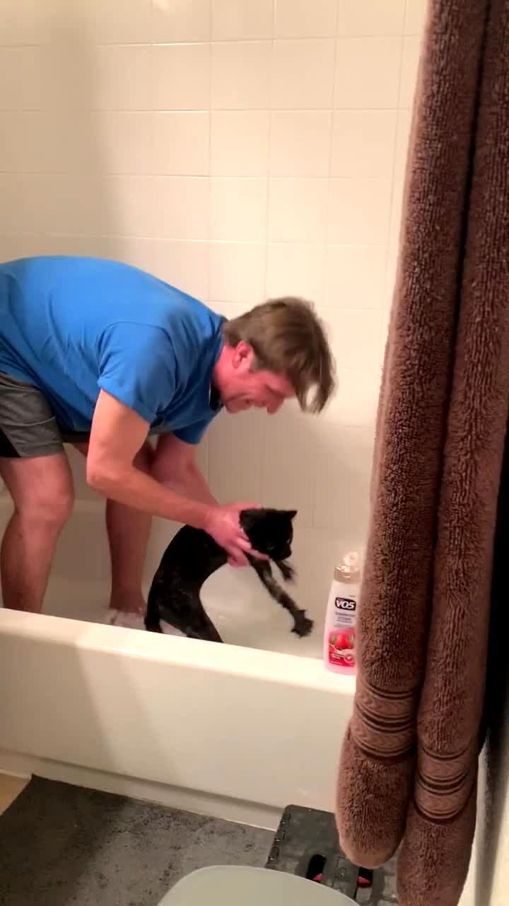 A man gives a cat a bath in a bathtub. The cat meows and the man thinks he says "I love you". The cat scratches him and jumps out of the tub, and the man screams.