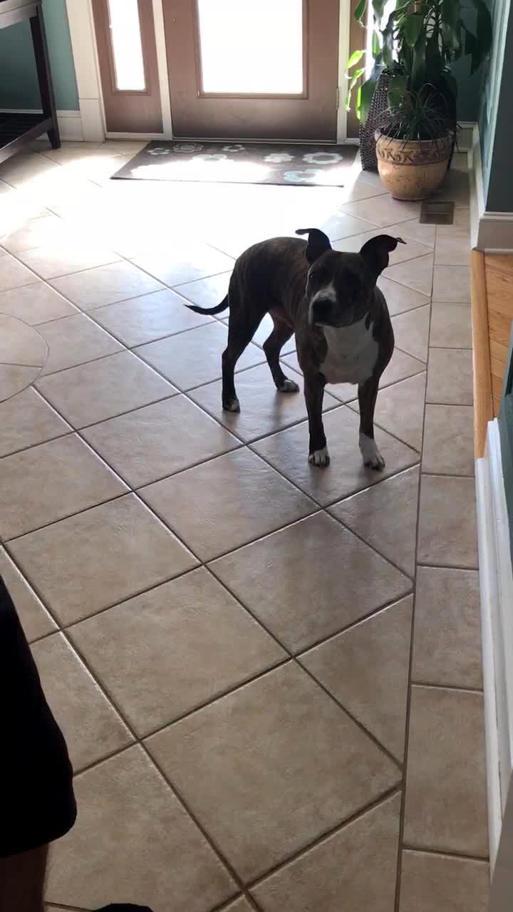 A dog in a home is scared of a cat and turns around and walks away backwards so it doesn't have to make eye contact with the cat.