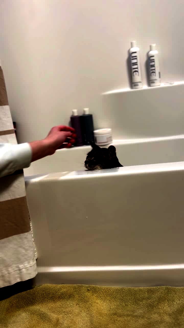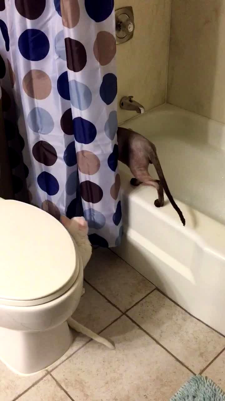A cat does not want to get out of the bath in bathroom and meows the word "NO".