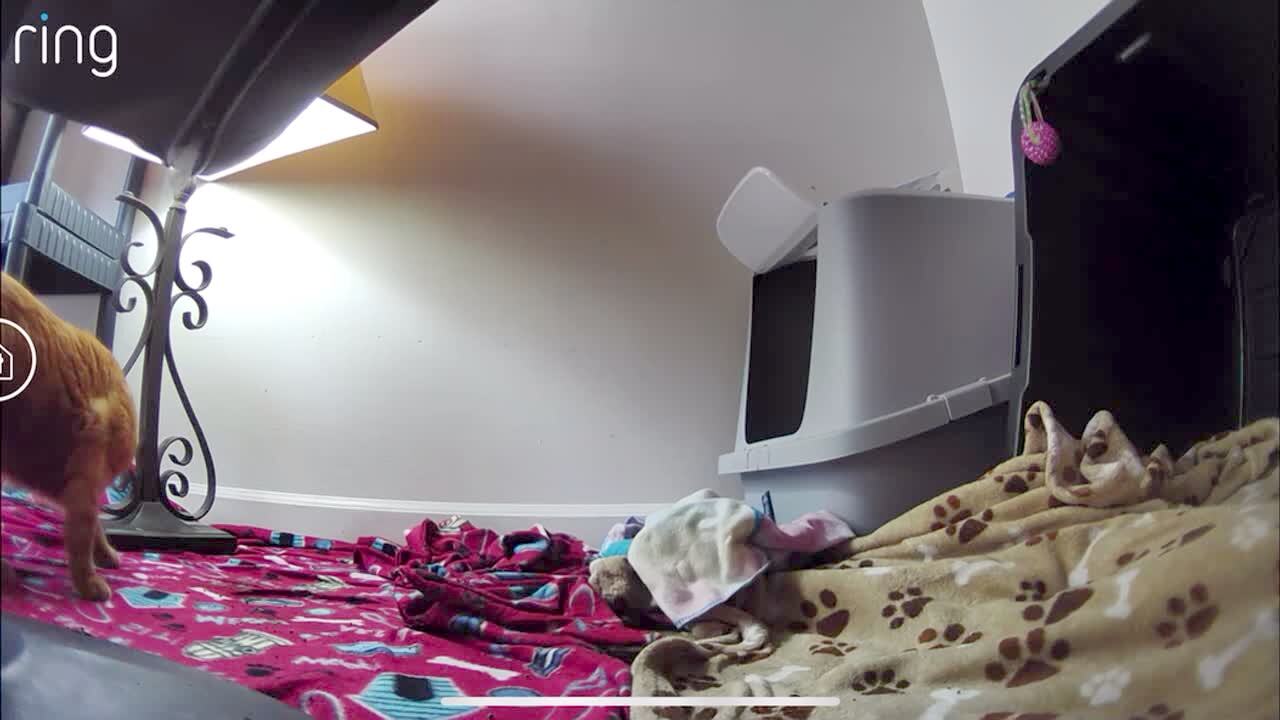 A woman says "hey" when she sees an orange cat in a room on a security camera, which causes the cat to back up and jump out of sight. Security footage.