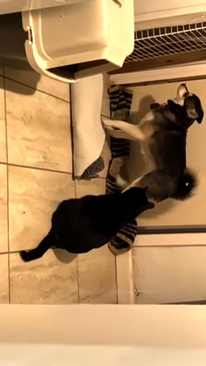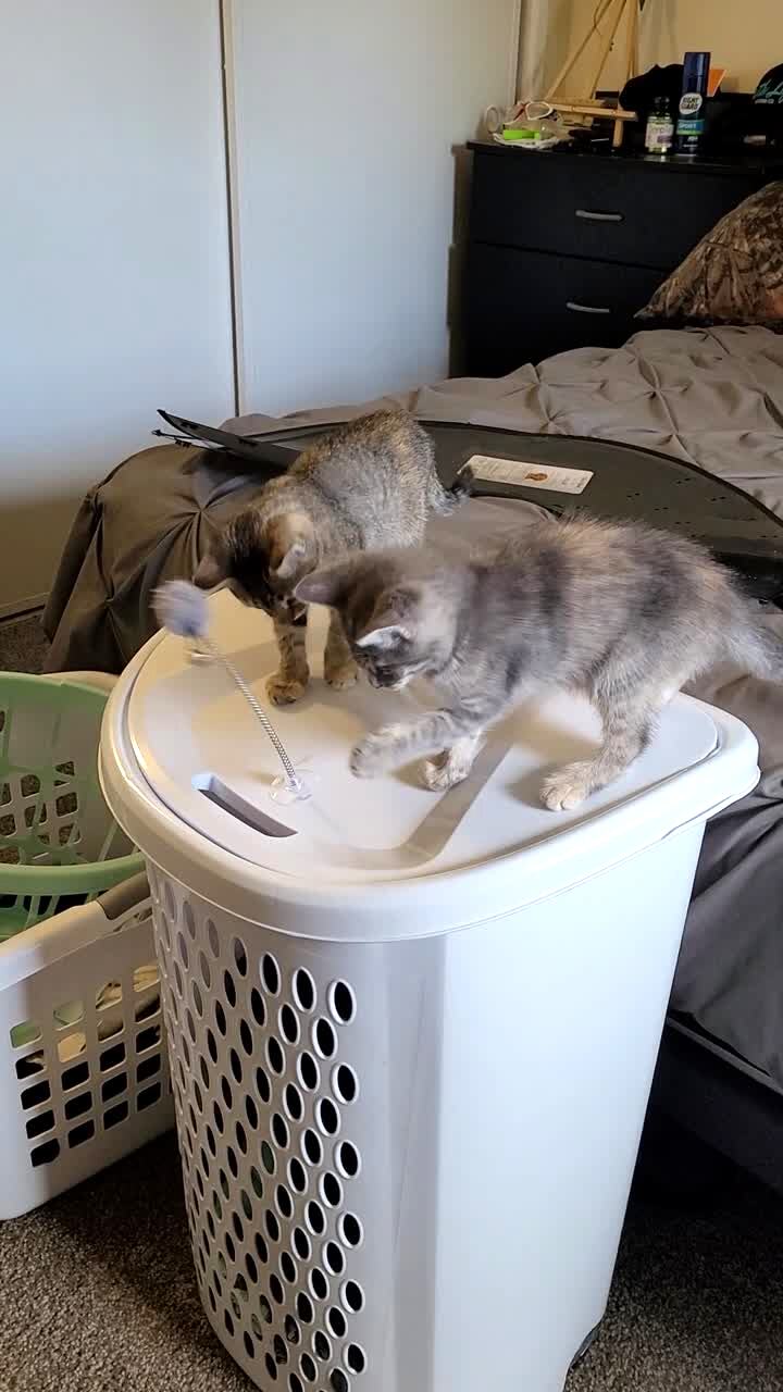 Two cats play on top of a laundry hamper in the bedroom but the lid gives way and they fall in.